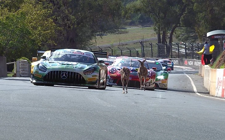 Одно из животных (вероятно, от страха из-за преследовавших его машин) упало, но тут же рвануло на обочину и в итоге нашло способ сбежать из ужасного места. Второй кенгуру оказался более стойким – он возглавил пелотон машин категории GT3, которым пришлось сбросить скорость и мирно преследовать новый вид сейфти-кара.