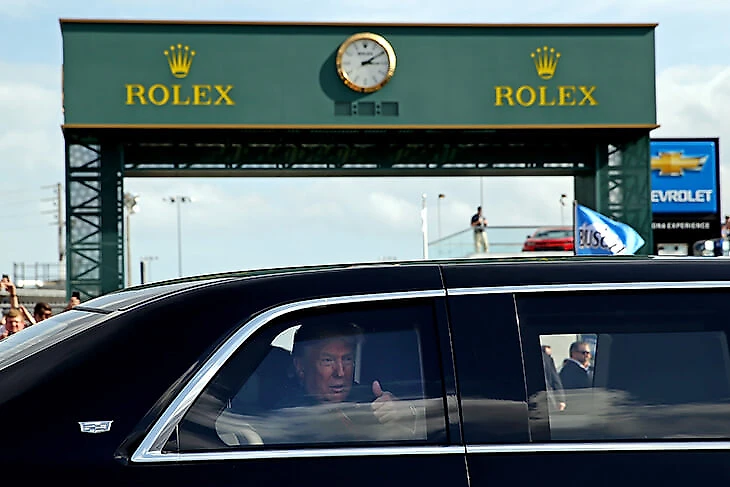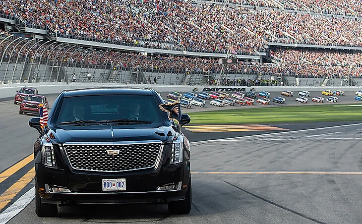 Трамп не ограничился одним лишь торжественным открытием: после над трассой пролетел его самолет, а сам глава США сел в бронированный президентский лимузин Cadillac One «Зверь» (The Beast) и проехал круг по «Дайтоне»! Правда, на бэнкинг водитель заехать не рискнул. А еще вместе лимузином выехали несколько внедорожников охраны.