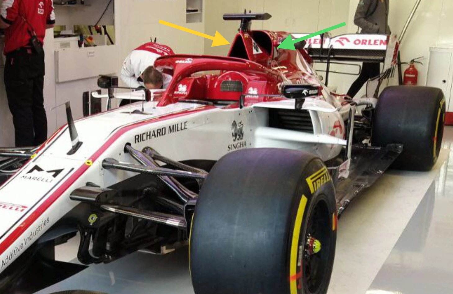 Что касается воздухозаборника, то он сохранил прошлогоднюю концепцию двух "ушей" (зелёная стрелка) по обе стороны от треугольного заборника (желтая стрелка) для большего охлаждения блока силового агрегата.