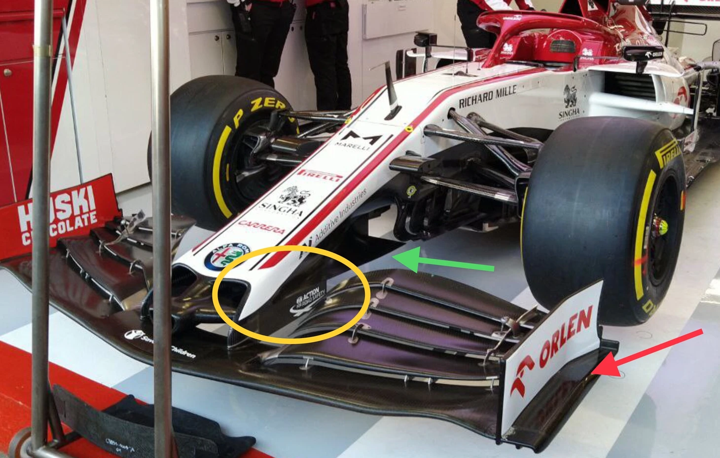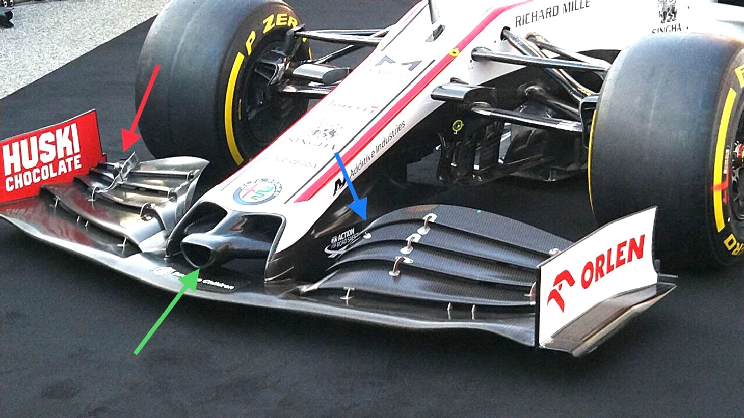 Конфигурация переднего крыла подтверждает и обостряет концепцию outwash с верхними открылками, которые особенно в крайних профилях (красная стрелка) не соединяются со слегка скрученными торцевыми пластинами (красная стрелка); в тоже время, в центральной области, они скручиваются, чтобы справляться с вредными вихревыми потоками. Что касается основного профиля, то он остается извилистым, а его наружная часть слегка поднимается вверх, чтобы направлять воздушные потоки в наружную часть машины. Основная концепция, как всегда, заключается в том, чтобы направить как можно больше воздуха в область за пределами колёс.