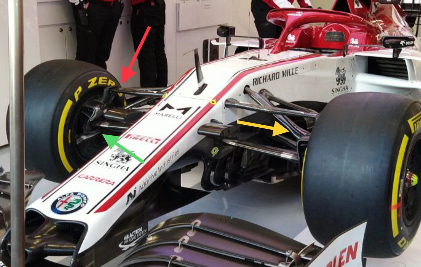 Что касается передней подвески Push Rod, то благодаря тому, что шины Pirelli остались такими же, как и в 2019 году, было решено усилить кинематические механизмы, подняв рычаги. В частности, нижний треугольник, которому предшествует рулевая тяга, теперь встроен в держатель ступицы на высоте центральной линии колеса (зеленая стрелка), для того, чтобы оставить зону боковых дефлекторов свободной от турбулентности. Верхний рычаг, расположенный действительно высоко, закреплен при помощи стержня к держателю ступицы (красная стрелка). Его задача состоит в том, чтобы направить воздушный поток к боковым понтонам. Стойка Push Rod тоже соединяется с помощью кронштейна (желтая стрелка) и упирается в тормозное гнездо, которое разделено на несколько перегородок для подачи воздуха в тормозную систему, а также для продувки.