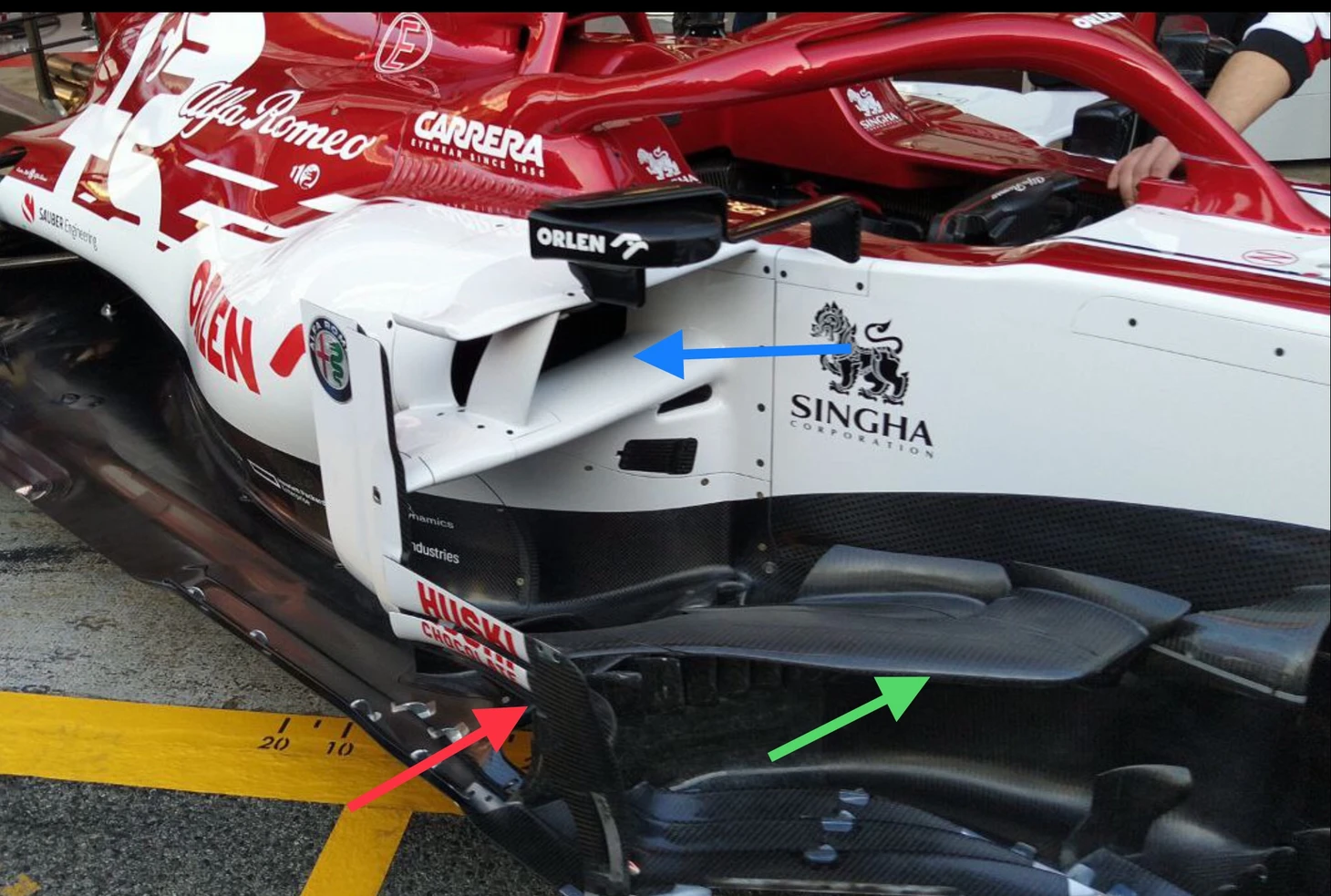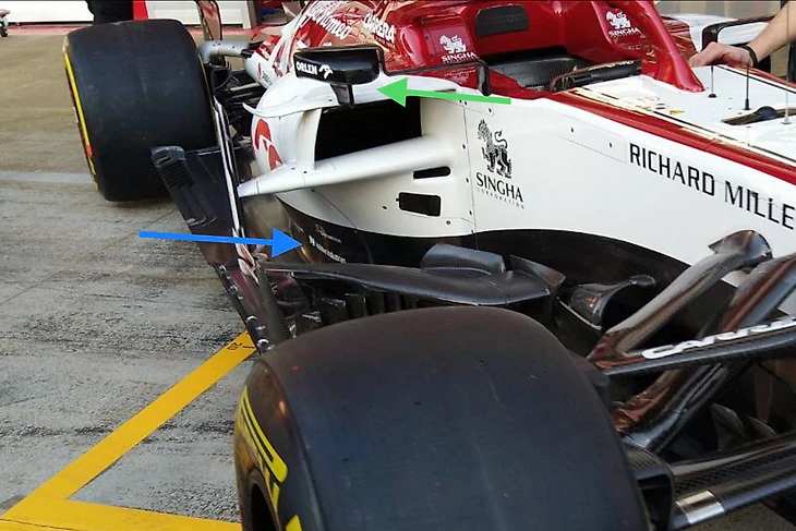 Зона боковых дефлекторов имеет классические зазубрины, чтобы активизировать поток воздуха и предотвратить его застой. Кроме того, элемент в форме бумеранга (зеленая стрелка) соединяется с небольшим дефлектором, который, как это ни странно, не соединяется с тем элементом, который огибает боковые понтоны (красная стрелка). Входное отверстие воздухозаборников на боковых понтонах (синяя стрелка) расположено выше, благодаря смещению раструба защитного приспособления, но в отличие от других машин с двигателями Феррари, оно имеет больший размер.