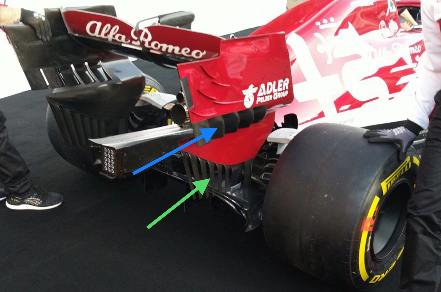 Именно поэтому боковины сужаются к задней части (синя линия), все же оставляя центральный горб для корпуса двигателя (зелёная линия). Кожух продолжается вплоть до подвесок, обтекая их для повышения аэродинамической эффективности . Очень массивный плавник завершается бипланом Deck-Wing для аэродинамической стабилизации задней части. Далее переходит к выхлопу, висящему над единственным выходом распределительного клапана Wastegate, вмонтированного в двойной пилон, который поддерживает крыло.