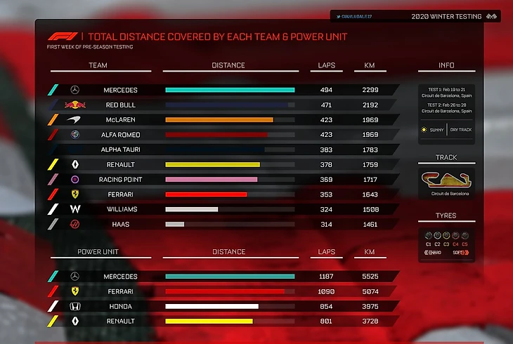«Мерседес» и «Ред Булл» преодолели по 7 дистанций Гран-при, «Макларен» и «Альфа Ромео» – по 6,5 дистанций гонки, «Альфа Таури» и «Рено» лишь немного не добрали до 6 дистанций. Даже проигравшие в этой номинации «Хаас» и «Уильямс» покрыли практически 5 полноценных заездов по «Барселоне-Каталонии» – в любой другой год их результат сочли бы отличным для первых тестов.