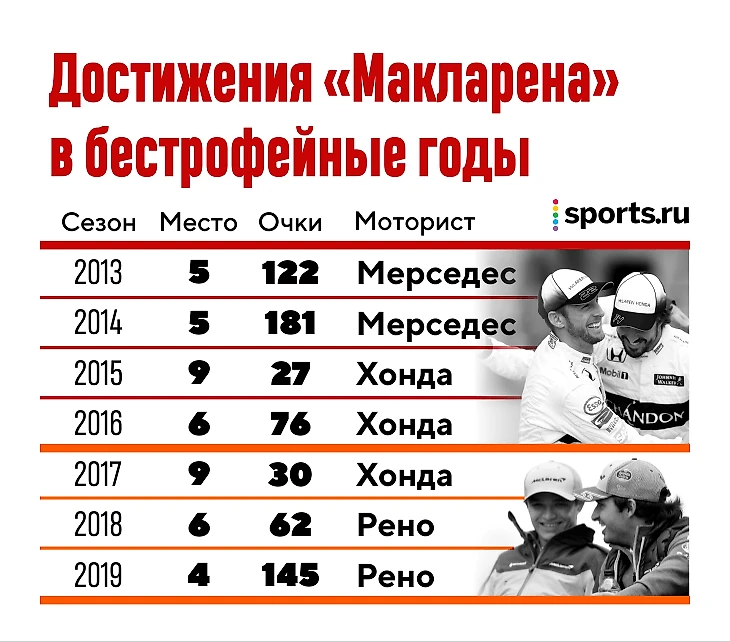 В 2013-м Браун продал JMI спортивному подразделению британской компании Chime Communications и стал его руководителем, а в 2016 году перешел на работу в «Макларен». После тяжелого периода с «Хондой» и девятого места в Кубке конструкторов последовали радикальные перемены: Алонсо ушел из «Формулы-1», а перестраивать команду принялись бывший глава «Порше» в WEC Андреас Зайдль и новый технический директор Джеймс Ки, перешедший из «Торо Россо». Первый успех – уверенное четвертое место в 2019-м.