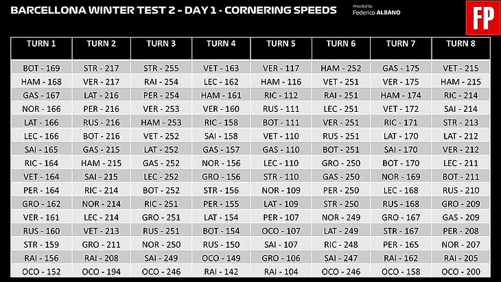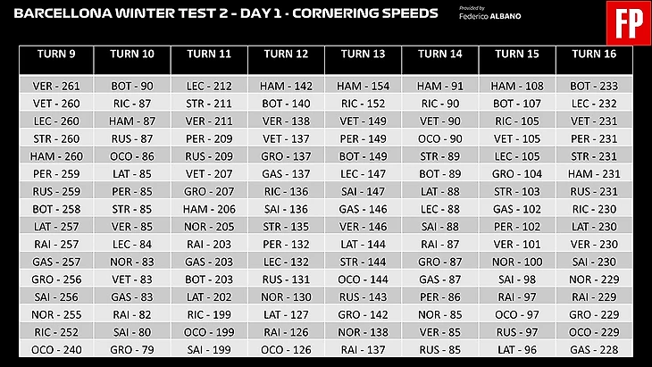 Единственный поворот, где Феррари действительно далека от своих непосредственных соперников – это 10 поворот и так было на протяжении всех тестов. Пока что трудно понять, идет ли речь о прохождении поворота не на пределе, стабильности на торможении или какой-то механическом недостатке, с которым ещё предстоит разобраться, но факт остается фактом, машина из Маранелло особенно много теряет именно здесь.