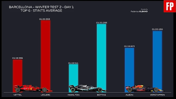 Ещё одним моментом, в котором Феррари выглядит очень близкой к соперникам является гоночный темп: усреднив время, показанное Феттелем во время утренней сессии, мы получим в среднем 1:19.596, менее чем в одной десятой от Льюиса Хэмилтона (1:19.511) и впереди Алекса Албона (1:19.8). Во второй половине дня (когда трасса была значительно медленнее) Макс Ферстаппен провел блестящую длинную серию кругов со средним временем 1:20.150, опередив Боттаса (1:20.285) и Леклера (1:20.353), уступившего Mercedes меньше десятой.