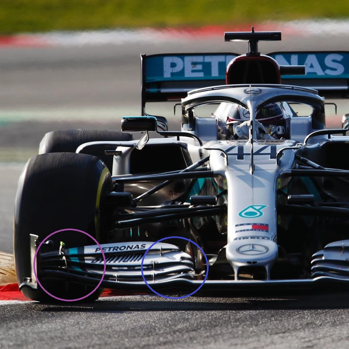 Смотрите, вот антикрыло с W11 – максимально поднятое «оперение», сложный узор на обрезке рядом с носом (синие круги).