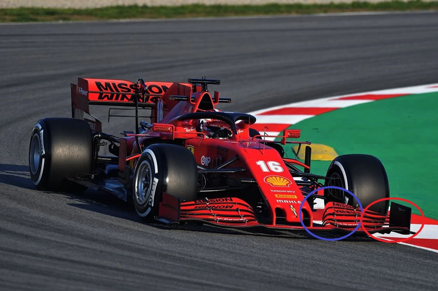 Теперь концепция «Феррари»: менее сложные генераторы вихря (синий круг), более мелкие пластины выдвинуты дальше к колесам, и щели между ними намного шире. Также у них совершенно другая форма – она словно стекает к внешней кромке (красный круг).