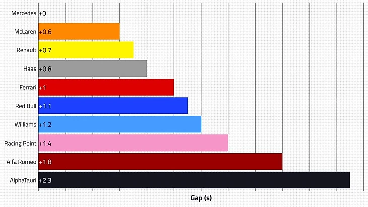 На быстром круге они уступили «Мерседесу» менее секунды. «Макларен» был быстрее только на одну десятую. Самое удивительное в том, что они показали самый большой рост по сравнению с «Мерседесом» на Гран-при Абу-Даби 2019 года.
