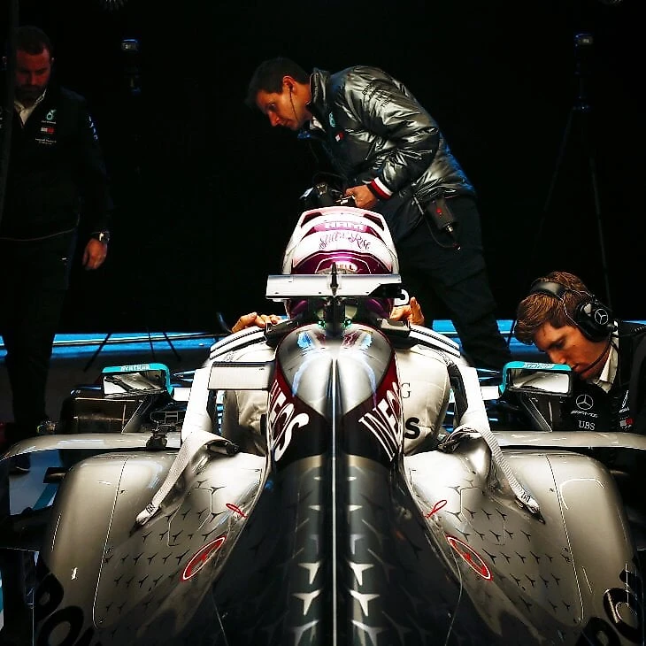 «Классика» в исполнении Льюиса хорошо подошла к красному акценту, появившемуся на ливрее команды благодаря началу сотрудничества с Ineos.