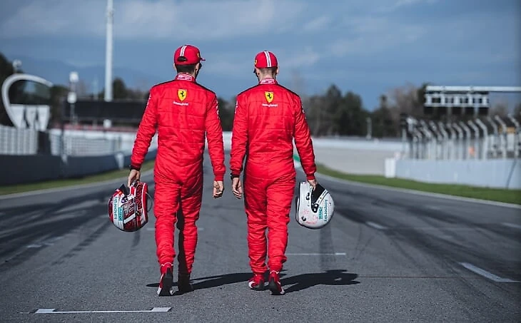 Оба шлема гонщиков «Феррари» хорошо сочетаются с цветами команды и приятно контрастируют друг с другом.