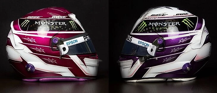 Льюис Хэмилтон не стал вносить кардинальные изменения в дизайн по сравнению с прошлым годом, однако подготовил два цветовых решения. Пурпурный или темно-фиолетовый – какой цвет больше подходит шестикратному чемпиону мира?
