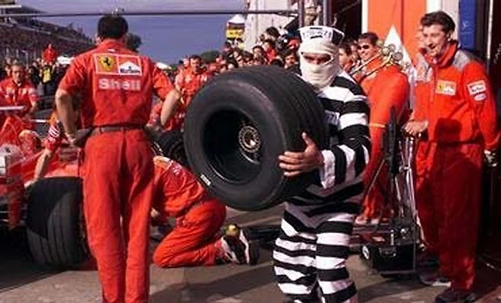 В ноябре 1999-го после финиша сезона итальянцы праздновали завоевание первого Кубка конструкторов c 1983-го на трассе «Валлелунга» под Римом и устроили небольшое представление: после нескольких выставочных кругов Михаэль Шумахер на болиде Ирвайна (сам Эдди не приехал, поскольку отпросился по семейным делам) заехал в боксы, где тот самый механик, одетый в тюремную робу, «своровал» то самое правое заднее колесо и бегал вокруг машины, не давая поставить его на место.