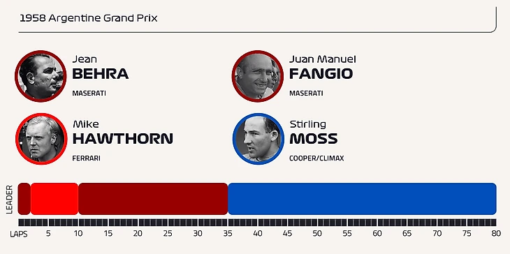 Мосс публично заявил, что не имеет шансов на победу, ведь пит-стоп отнимет у него целую вечность. Но штука была в том, что он то и не собирался делать этот самый пит-стоп. Он попросил Фрэнсиса заправить машину на всю дистанцию. Мосс в начале гонки никуда не рвался на своей тяжелой машине и шел пятым, в то время как местный герой и действующий чемпион мира Фанхио быстро разобрался с Жаном Бера на Maserati и Майком Хоторном на Ferrari и начал отрываться. Ferrari Питера Коллинза потеряла приводной вал на самом старте, так что одним соперником было меньше.