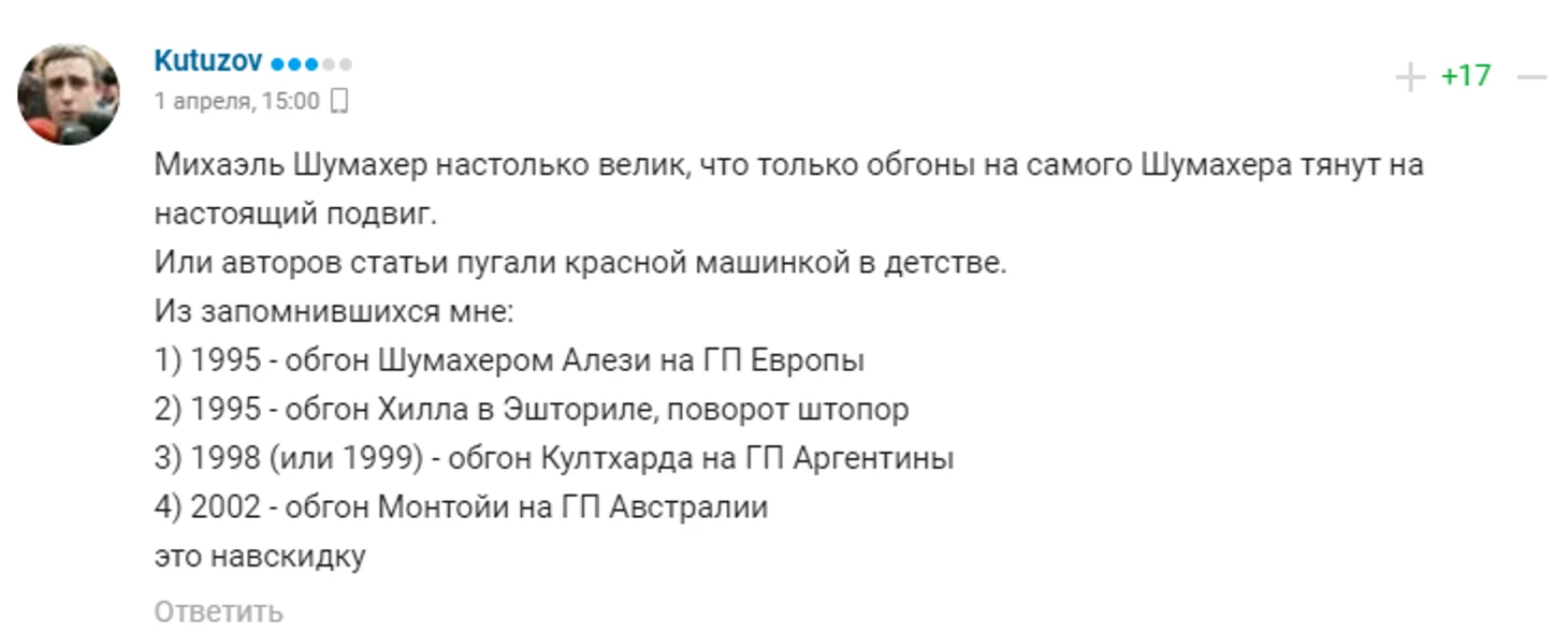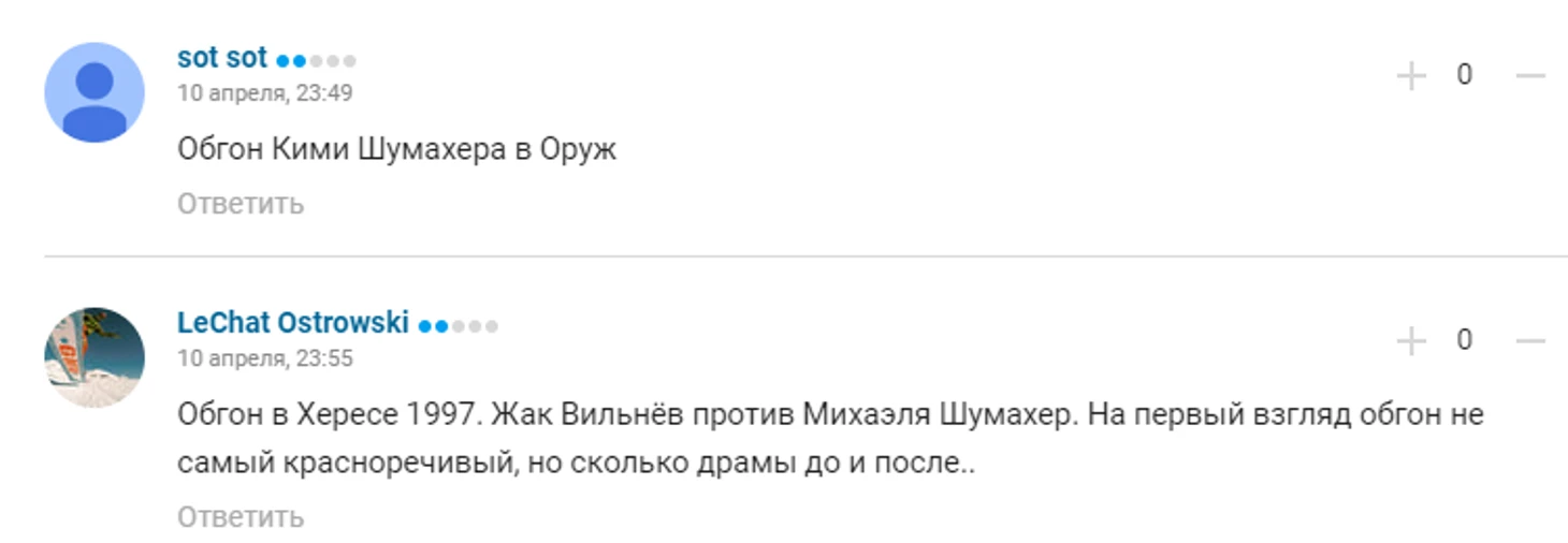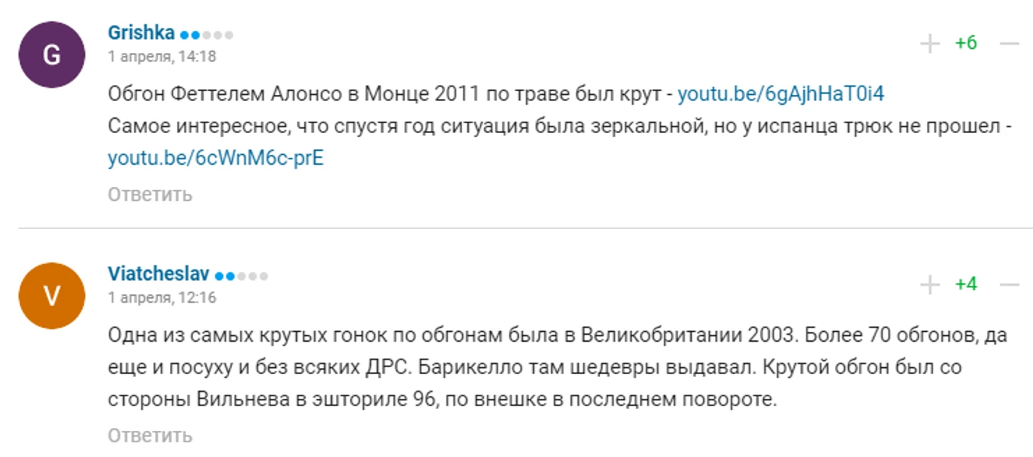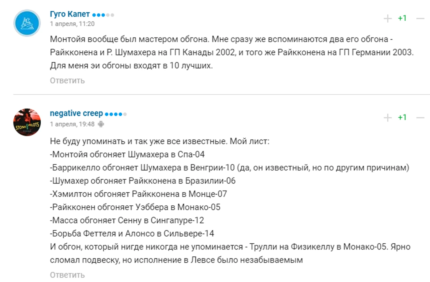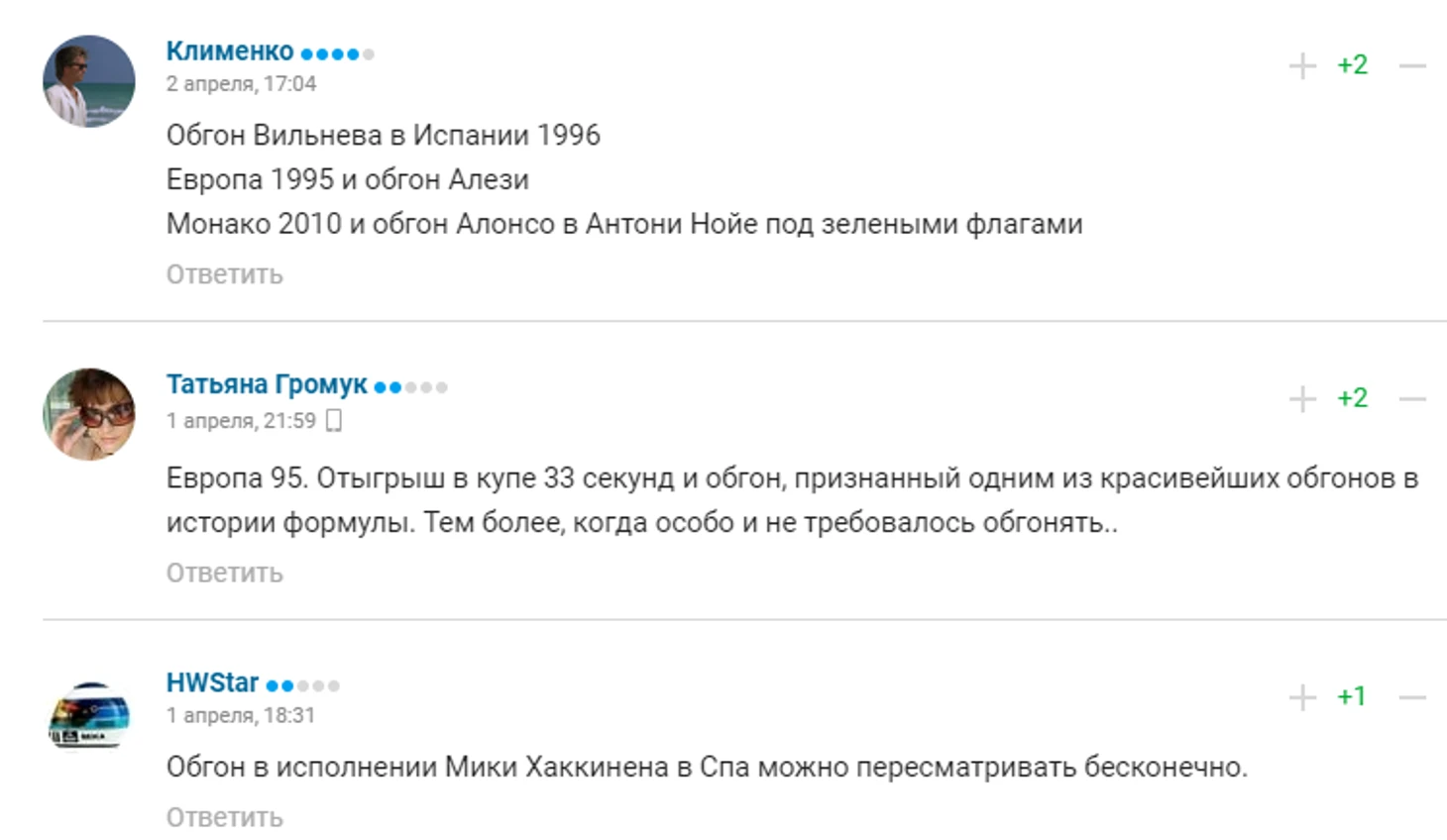 В начале апреля авторы Sports.ru вспоминали (раз, два) о своих любимых обгонах в «Формуле-1». Вы присоединились к флешмобу в комментариях – вот лучшие из них.