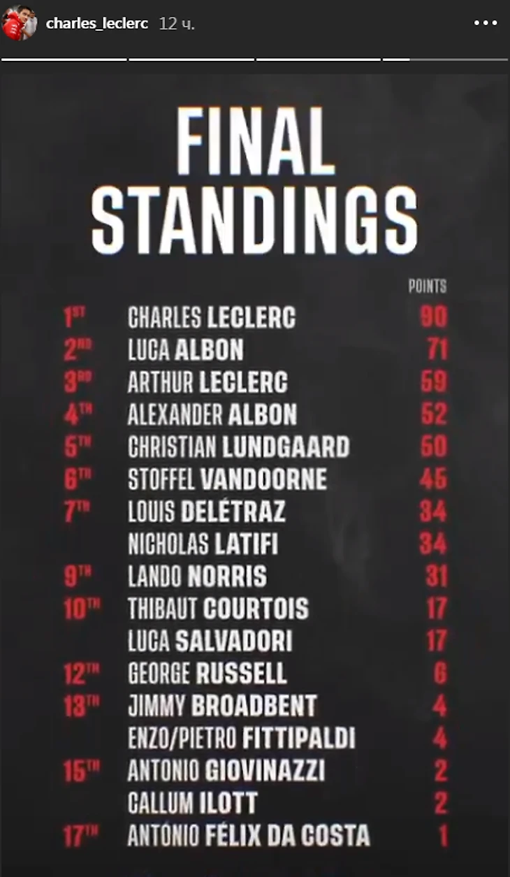 А в итоге чемпионом Race for the World стал все-таки Леклер. Вторым оказался младший брат Алекса Албона Лука, а третьим – Артур из «Формулы-4» и программы «Заубера».