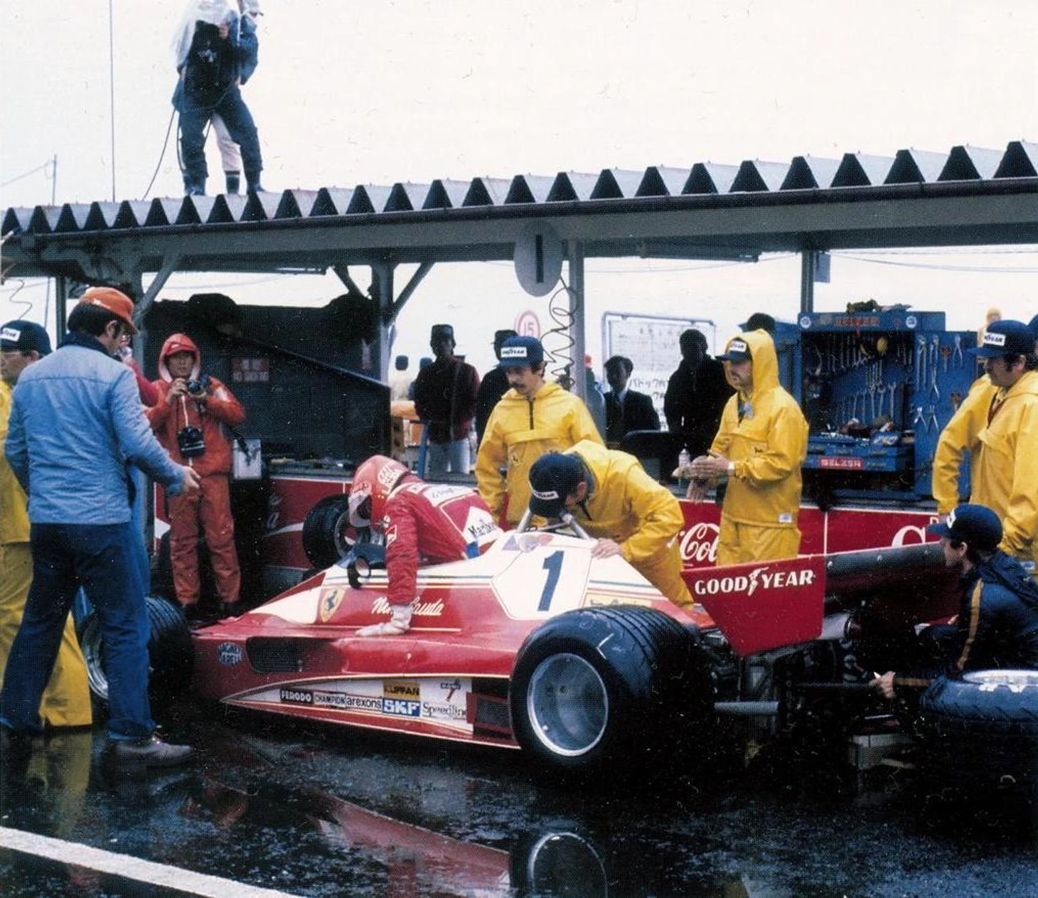 Ключевой момент Чемпионата мира '76. «Феррари» Лауды в боксах - австриец счел условия на трассе слишком опасными для гонок.