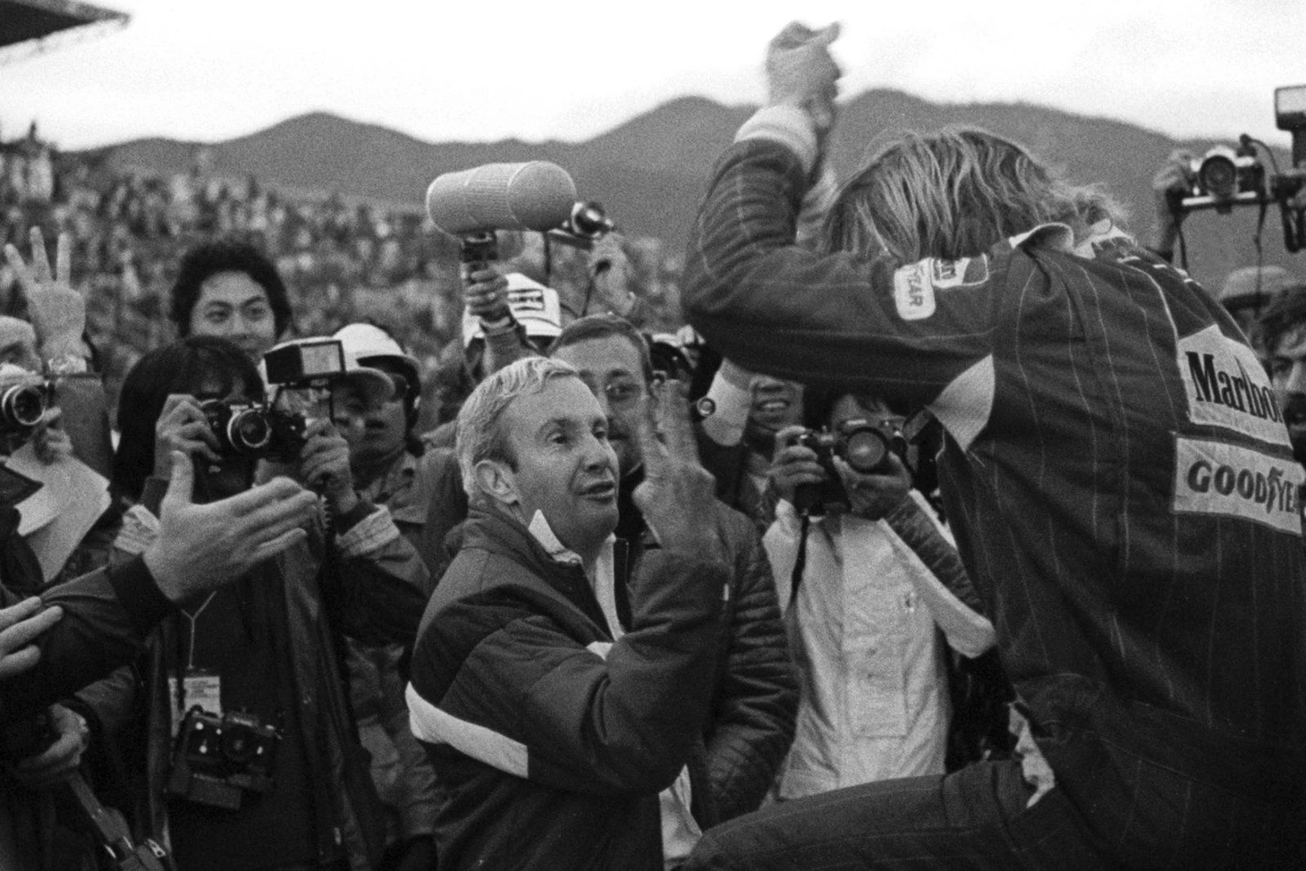 Тем временем дождь прекратился и трасса начала подсыхать. В боксах менеджер «Макларен» Тедди Майер ломал голову: оставить лидировавшего Ханта на старых дождевых покрышках или позвать в боксы за новым комплектом? На прямых Джеймс пытался выбирать траектории с большим количеством воды, но это не уберегло левую переднюю шину от расслоения на 68-м круге. Хант дотянул до боксов, где провел мучительно долгие 27 секунд, наблюдая, как механики возятся в попытках установить домкрат (заглавное фото). Левая передняя часть машины стояла на голом ободе и дорожного просвета не хватало, чтобы засунуть домкрат под днище. В конце концов один из механиков догадался приподнять болид за рычаги передней подвески. Британец вернулся в гонку, до конца которой оставалось лишь 5 кругов, на пятой позиции. На свежих шинах он догнал и прошел Клея Регаццони и Алана Джонса, закончив гонку на третьем месте, которого вполне хватало для завоевания титула. При этом сам Хант понятия не имел, на каким месте он финишировал, и лишь на пит-лейн узнал, что стал Чемпионом мира, не сразу в это поверив.