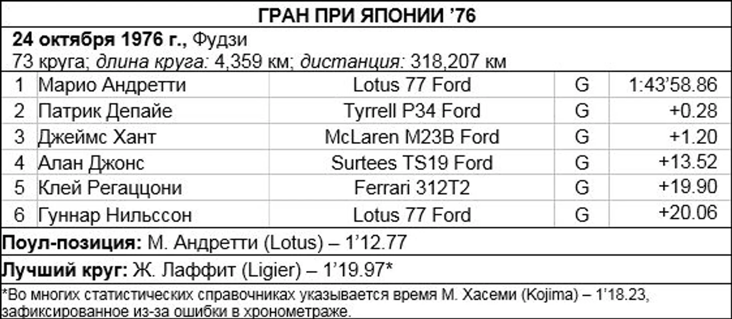 Впервые попав в календарь Чемпионата мира в год эпической дуэли Джеймса Ханта и Ники Лауды за титул, японский этап 1976 года оказался одним из самых захватывающих и драматичных Гран При в истории автогонок.