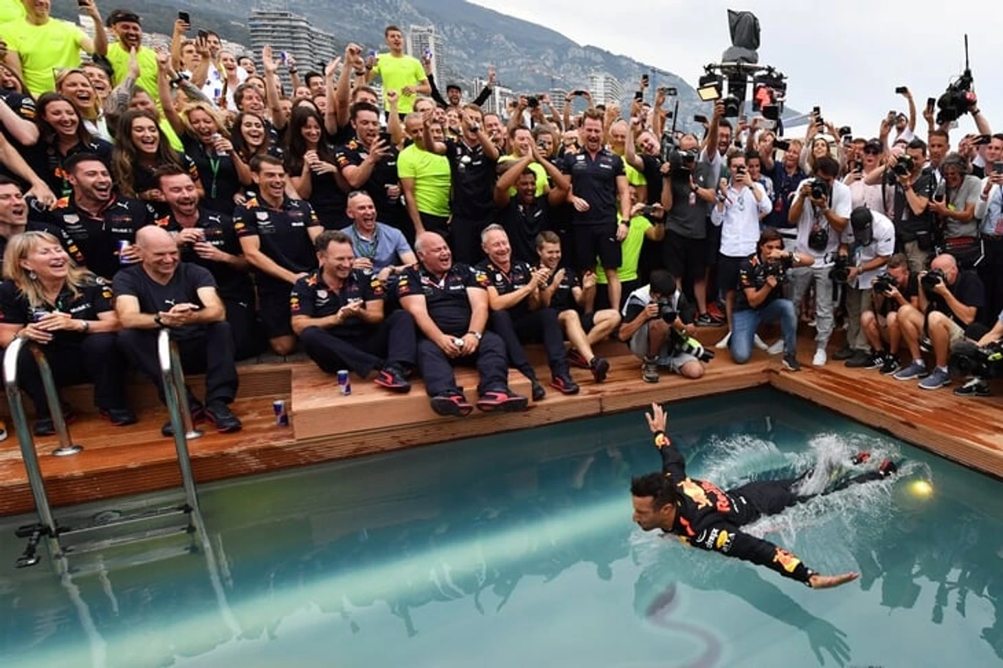 А на следующий год у нас была такая фотка «беллей флоп» – Даниэль Риккардо в бассейне в Монако. Он не прыгал, просто остановился на краю и упал. Я сделал фотографию, отличную фотографию, он прямо на воде. Еще не в воде, брызги только поднялись. Это волшебная фотография.