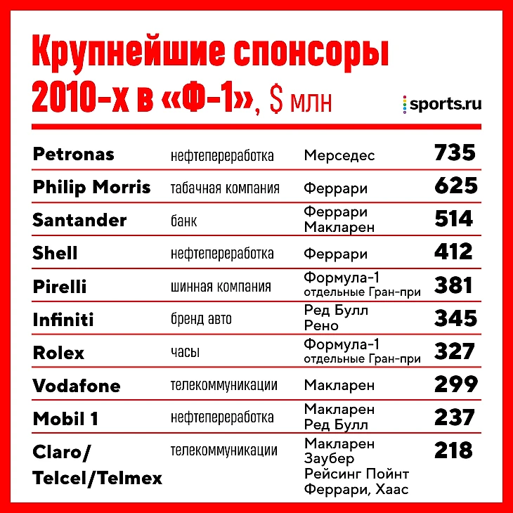 В сумме объем спонсорских выплат этой десятке на счета команд и «Формулы-1» составил могучие 4094 миллиона долларов (4,094 миллиарда!).