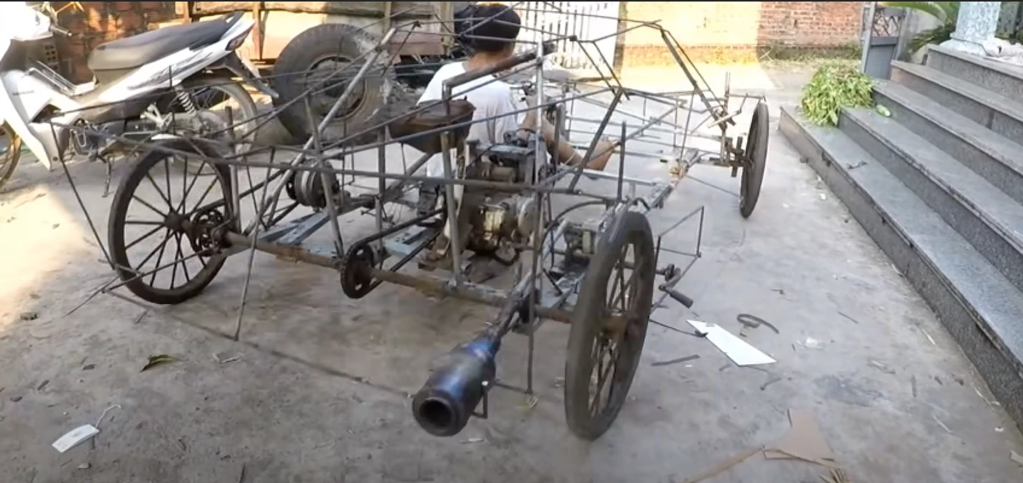 Вот с чего все начиналось: старые велосипедные колеса, монокок из металлических трубок, двухтактный мотор с разбитой рикши.