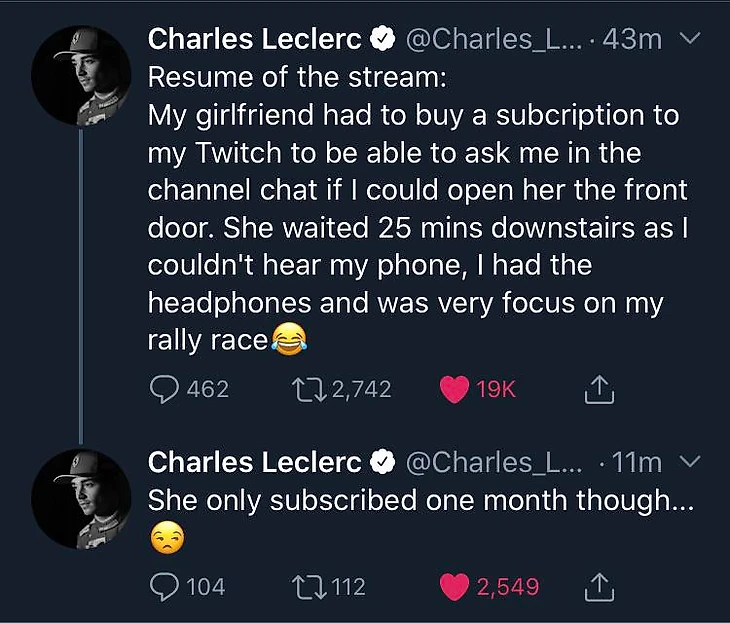 Во время карантинов и вынужденного большого межсезонья Шарль Леклер из «Феррари» проследовал за коллегой Ландо Норрисом из «Макларена» и создал на твитче канал со стримами. Там №16 регулярно выходит в прямой эфир и радует фанатов онлайн-гонками в «Формуле-1», на симуляторах rFactor, iRacing и Asetto Corsa, а рубкой во всевозможных шутерах вроде Call of Duty.