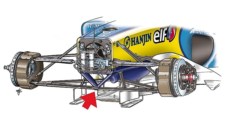 Из-за этой озабоченности максимизацией потока на днище, велись постоянные поиски наименее аэродинамически разрушительной точки крепления передней подвески на внутреннем торце. В течение многих лет стандартным методом было прикрепление нижних поперечных рычагов с каждой стороны к центральному «килю» в этой части монокока.