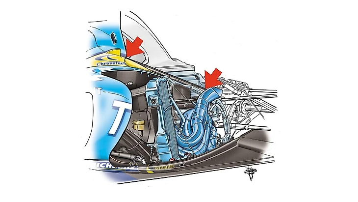 Не весь доступный поток воздуха в передней части автомобиля использовался для создания прижимной силы с переднего крыла. Различные элементы направляли большую часть потока воздуха назад.
