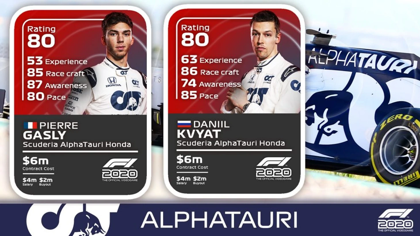 Как видим, и Даниила Квята, и Пьера Гасли оценили выше Алекса Албона из «Ред Булл» по общему рейтингу – по 80 против 79. Россиянина посчитали более сильным по сравнению с напарником по части обгонов (86 против 85) и более быстрым по темпу по сравнению с обоими конкурентами (85 против 83 у Албона и 80 – у Гасли).