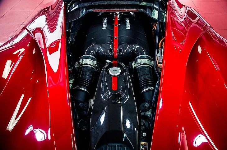 Гибридные компоненты добавляют в общей сложности только 146 кг к весу LaFerrari, но при этом обеспечивают дополнительную 161 л.с. и 257.6 Нм крутящего момента для 6.3 – литрового мотора V12 мощностью 789 л.с. и 701 Нм крутящего момента. В итоге общая мощность двигателя достигает 950 л.с. и 972 Нм крутящего момента. Мы бы сказали, что это справедливый компромисс. Два блока батарей, каждый из которых состоит из четырех 15-элементных модулей, в общей сложности 160 элементов, находятся чуть ниже и позади сидений, под топливным баком и впереди V12. Литий-ионные элементы предоставлены компанией Samsung, но аккумуляторные батареи, защищённые от мусора на дорогах, были разработаны «Феррари». Слой стекла электрически изолирует аккумулятор от остальной части салона.
