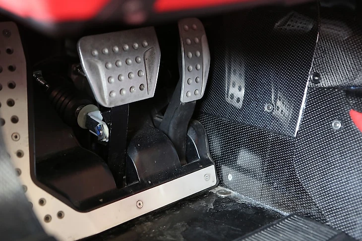 Смирившись с условиями, я побольше осмотрю салон. Он довольно строгий. На четыре круглых вентиляционных отверстия приятно смотреть. Они выполнены качественно. Практически все, что вы видите и трогаете, — это полированное карбоновое волокно, отделанной алькантарой. Тонкие резиновые напольные коврики обеспечивают немного сцепления ног. Рядом с коленями пассажиров имеется карман для карт. Есть место для телефона. Итальянцы решили, что телефона будет достаточно. Дверные панели широко выгнуты, что создает много свободного пространства для локтей. Вряд ли вы будете мешать друг другу. Центральная консоль из углеродного волокна имеет кнопки для включения заднего хода, автоматического режима трансмиссии и управления запуском.