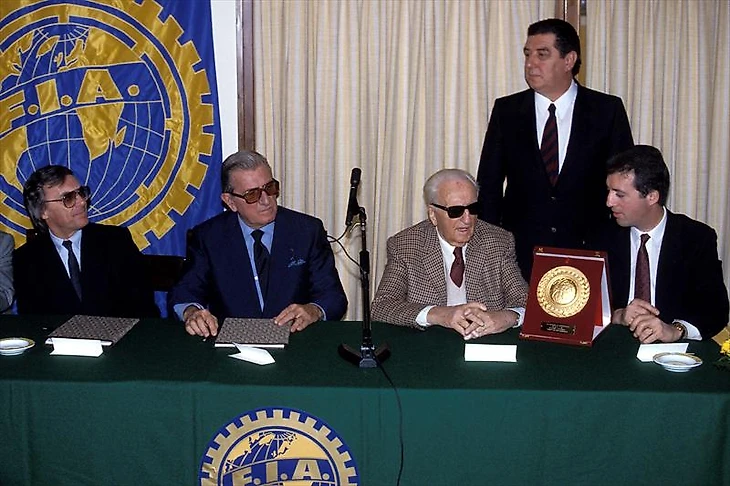Берни Экклстоун, Жан-Мари Балестр, Энцо Феррари, Пьеро Ларди-Феррари и Франко Гоцци (стоит) на подписании Договора Согласия в 1987 году