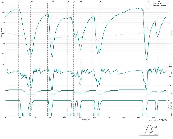 Однако с первого сезона в Гран-при главной фишкой англичанина стали максимально поздние торможения: Льюис непостижимым образом лучше всех в пелотоне затягивал с нажатием на педаль (в рамках выбора траекторий, конечно же) вплоть до последнего теоретически возможного мгновения, при котором машина еще способна была достаточно замедлиться, чтобы преодолеть вираж. Данную способность Хэмилтон постоянно использует и теперь – сравните, например, его телеметрию с показателями Валттери Боттаса в квалификации на Гран-при Китая-2019.