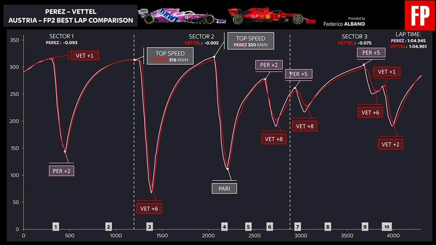 Сравните лучшие круги Серхио Переса и Себастьяна Феттеля во второй практике – мексиканец практически на каждой прямой был быстрее.