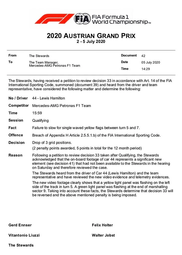 «Гонщик не замедлился в зоне желтых флагов между пятым и седьмым поворотами. После заявления о пересмотре эпизода судьи рассмотрели онборд с машины №44, обнаружив важное новое свидетельство, недоступное во время слушаний в субботу.