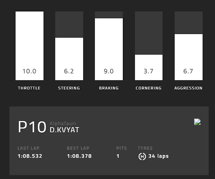 Третье место занял россиянин Даниил Квят. Его оценка в 7,1 сложилась из 10 (лучший балл) за работу с педалью газа, 6,2 за работу рулем, 9,0 за работу на торможениях, 3,7 за прохождение поворотов и 6,7 за «агрессивность». Пилот «Альфа Таури» стартовал 13-м и приехал 10-м.