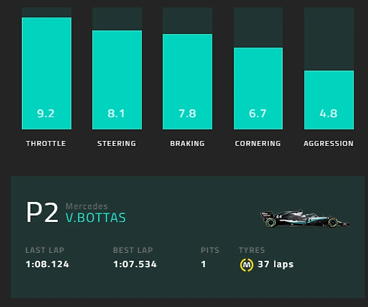 Второе место досталось Валттери Боттасу из «Мерседеса». Его оценка в 7,3 сложилась из 9,2 за работу с педалью газа, 8,1 за работу рулем, 7,8 за работу на торможениях, 6,7 за прохождение поворотов и 4,8 за «агрессивность». Финн стартовал четвертым, обогнал на трассе Карлоса Сайнса и Макса Ферстаппена и в итоге финишировал вторым.