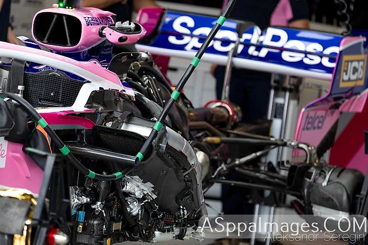Болид Racing Point F1 Team ex Force India F1 Team, достаточно редкий фотоснимок, поскольку команды стараются скрыть от объективов детали внутренностей болидов, в данном случае было удобно рассмотреть и сфотографировать и коробку передач, и двигатель и устройство вокруг воздухозаборника авто,Canon EOS 5D Mark IV, Canon EF 70-200mm f/2.8L IS II USM +1.4x III, 280 mm, 1/250 sec., f/4,5, ISO 640фоторепвцтаж с этапа “Формулы-1” в Монако, МАЙ 2019. © Фотоагентство ASppaImages ANO (АСППА ИМАДЖЕС АНО) email: aspressphoto@gmail.com Фотожурналист Александр Серегин