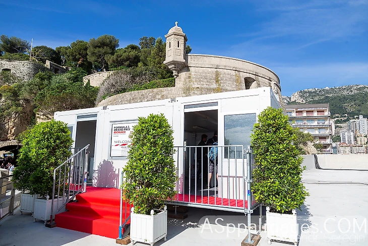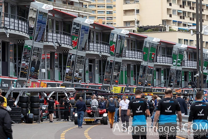 Справа вид на пит-лейн “Формулы-1”, слева небольшое модульное здание Паддок-клуба для VIP гостей, Canon EOS 5D Mark IV, Canon EF24-105mm, f/4L IS USM, 24 mm, 1/500 sec., f / 6,3, ISO 250, фоторепортаж с этапа “Формулы-1” в Монако, МАЙ 2019. © Фотоагентство ASppaImages ANO (АСППА ИМАДЖЕС АНО) email: aspressphoto@gmail.com Фотожурналист Александр Серегин