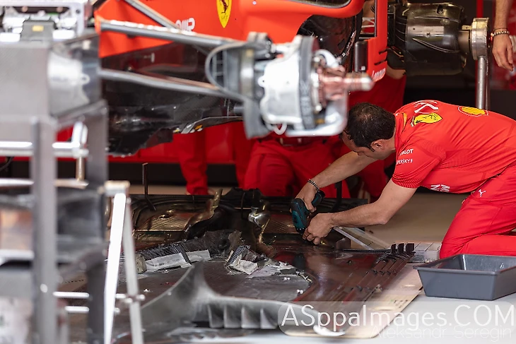 Боксы Scuderia Ferrari F1 Team, тоже редкий фотоснимок. Днище машин команды стараются не показывать конкурентам и всячески скрывают их. В данном случае работы были неотложные, поэтому пришлось работать “в открытую”. Достаточно хорошо можно разглядеть дно машины изнутри. Снято Canon EOS 5D Mark IV, Canon EF 70-200mm f/2.8L IS II USM, 98 mm, 1/400 sec., f/4, ISO 500, фоторепортаж с этапа “Формулы-1” в Монако, МАЙ 2019. © Фотоагентство ASppaImages ANO (АСППА ИМАДЖЕС АНО) Tel: +7 (968) 948-5103 email: aspressphoto@gmail.com Фотожурналист Александр Сереги