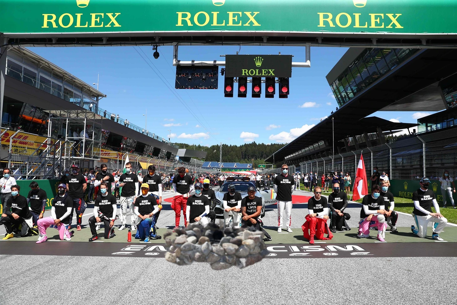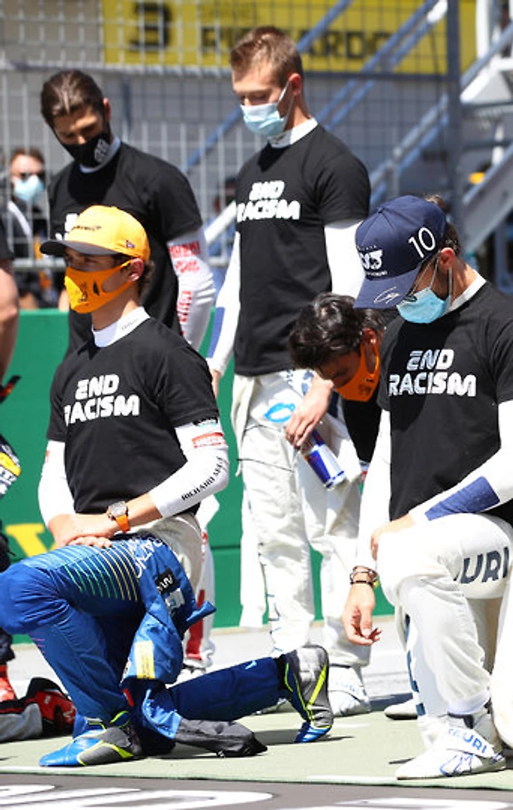 А вся это показуха с коленями как-то не вызывает восхищения у других. То все готовятся встать на колено, то включается гимн страны. А когда играет гимн надо стоять (привет пиращикам!). В результате получаются такие комичные фотографии, которые облетают весь интернет, на которой даже за маской заметно негодование остальных пилотов.