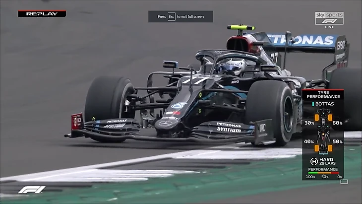 А самое печальное в положении Боттаса – даже не внезапность прокола. На самом деле Валттери еще за 10 кругов до финиша предупреждал команду об «ухудшающихся вибрациях» – и вот как тогда выглядели его покрышки.