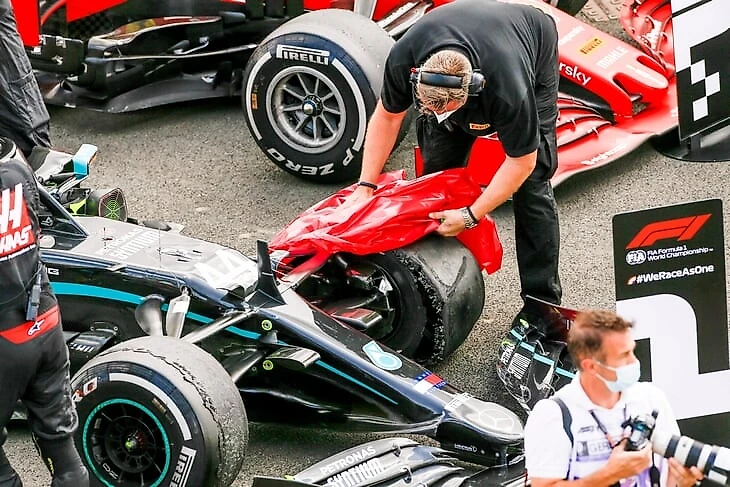 В доминирование «Мерседесов» и размеренный ход гонки вмешался итальянский диверсант – на сей раз не «Феррари», а «Пирелли»: за три круга до клетчатого флага Валттери Боттас обнаружил на месте левого переднего колеса болтающуюся тряпочку. Второе место улетело на обочину вместе с ошметками резины, как и десятисекундный отрыв от Ферстаппена, а Хэмилтон, как тогда казалось, мог вздохнуть спокойно (№77 прессинговал все 50 кругов и к моменту происшествия отставал всего на 2-3 секунды) и катить к финишу.