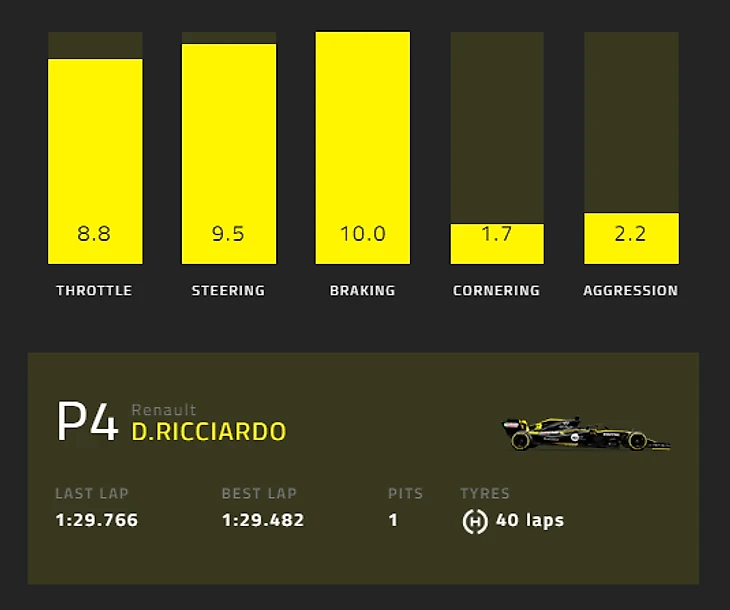 Третье место занял Даниэль Риккардо из «Рено». Его оценка в 6,5 сложилась из 8,8 за работу с педалью газа, 9,5 за работу рулем, 10 за работу на торможениях, 1,7 за прохождение поворотов и 2,2 за «агрессивность». Австралиец приехал четвертым после старта на восьмой позиции.