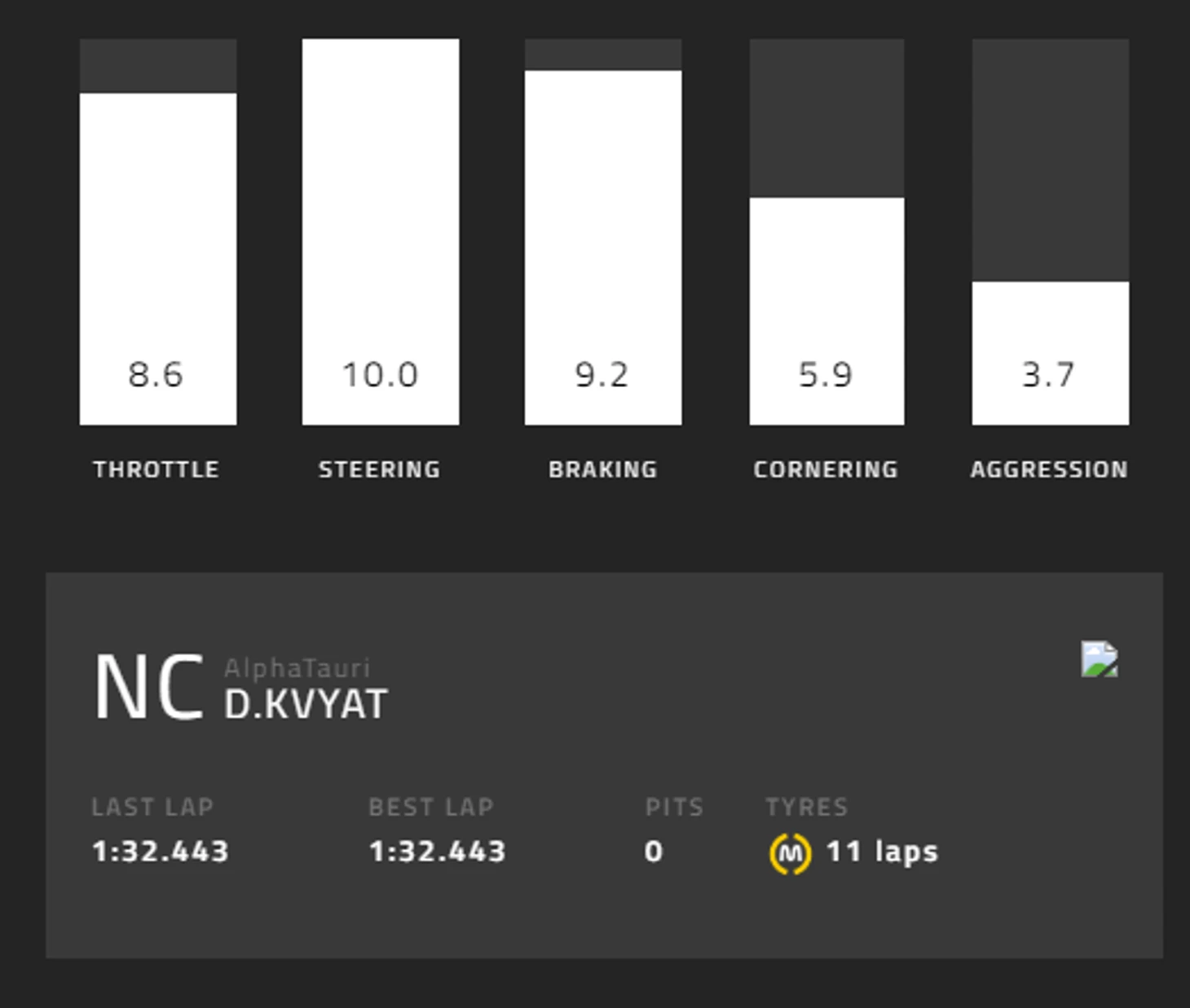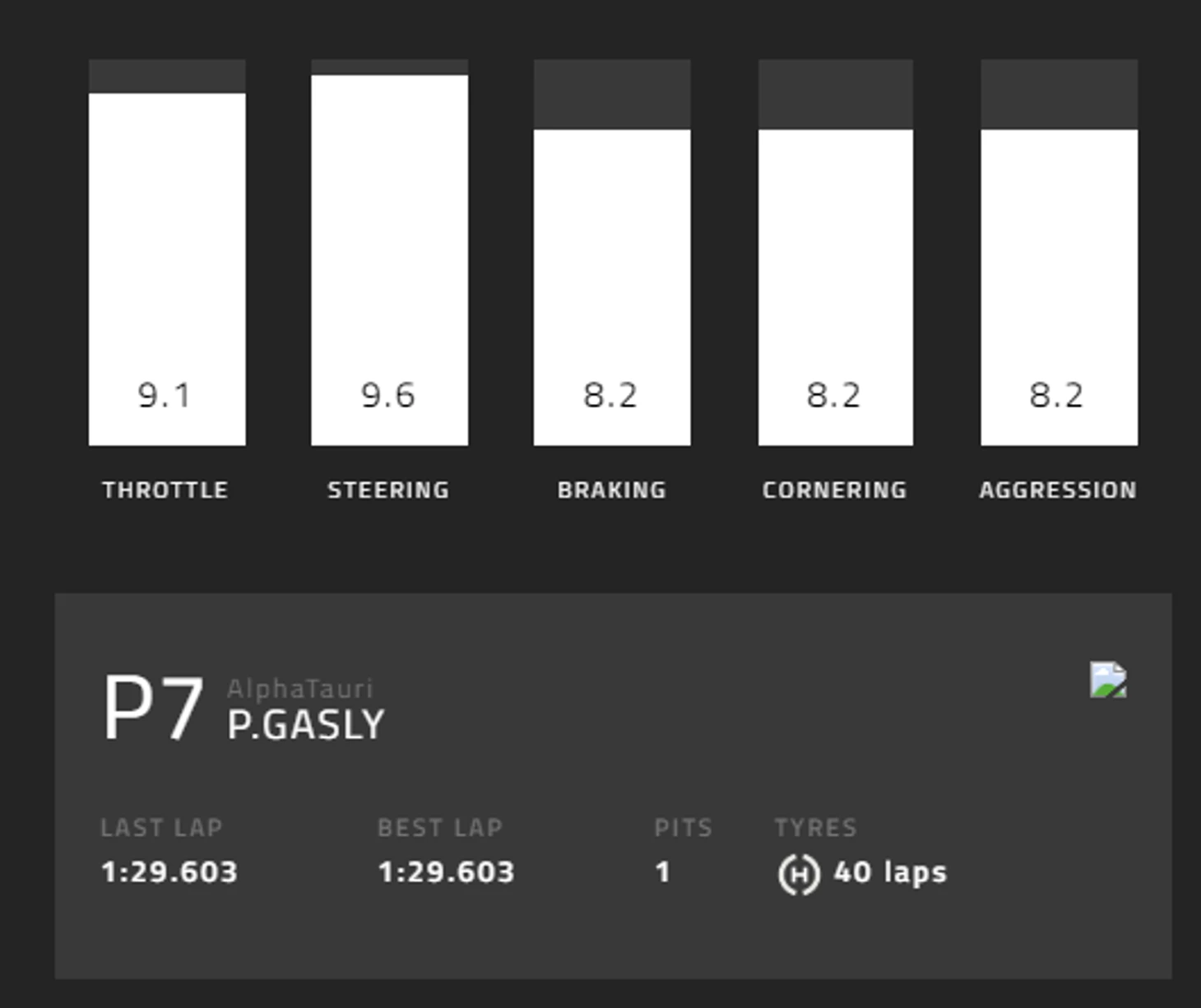 В соответствии с рейтингом лучше всех пилотировал Пьер Гасли из «Альфа Таури» – его оценка в 8,7 сложилась из 9,1 за работу с педалью газа, 9,6 за работу рулем и 8,2 за работу на торможениях, 8,2 за прохождение поворотов и 8,2 за «агрессивность». Француз стартовал 11-м и финишировал 7-м.