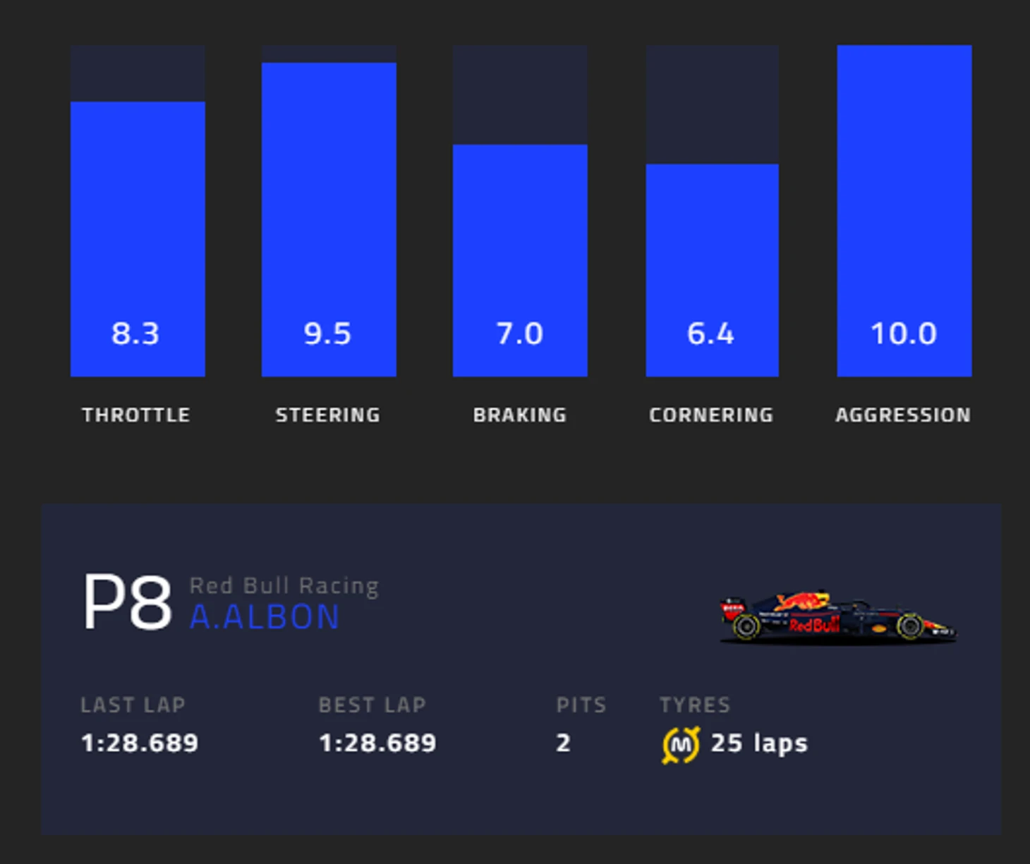 Второе место досталось Алексу Албону из «Ред Булл». Его оценка в 8,2 сложилась из 8,3 за работу с педалью газа, 9,5 за работу рулем, 7,0 за работу на торможениях, 6,4 за прохождение поворотов и 10 за «агрессивность». №23 стартовал 12-м и финишировал восьмым.