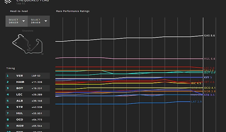 После каждой гонки на официальном сайте «Формулы-1» в разделе лайвтайминга на странице «выступлений» публикуются оценки пилотам за Гран-при по данным телеметрии. Вот – рейтинг после второго заезда в Великобритании под эгидой «Гран-при 70-летия «Формулы-1».