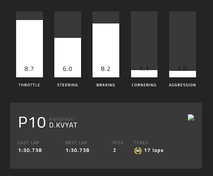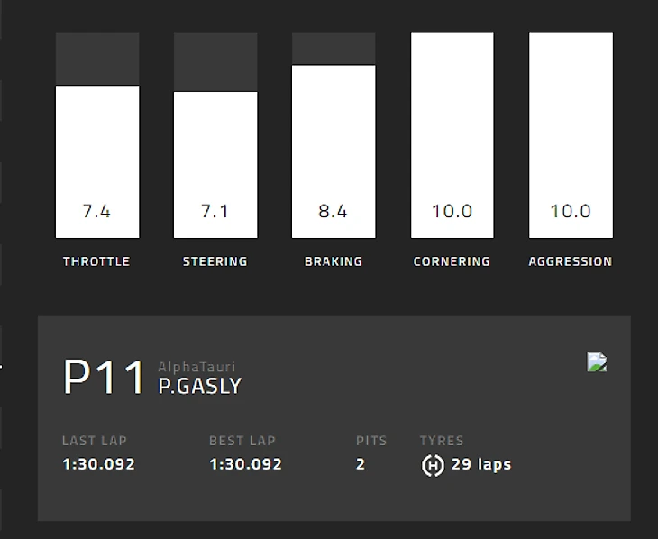 В соответствии с рейтингом вторую гонку подряд лучше всех пилотировал Пьер Гасли из «Альфа Таури» – его оценка в 8,6 сложилась из 7,4 за работу с педалью газа, 7,1 за работу рулем и 8,4 за работу на торможениях, 10 за прохождение поворотов и 10 за «агрессивность». Француз финишировал 11-м после старта 7-м.